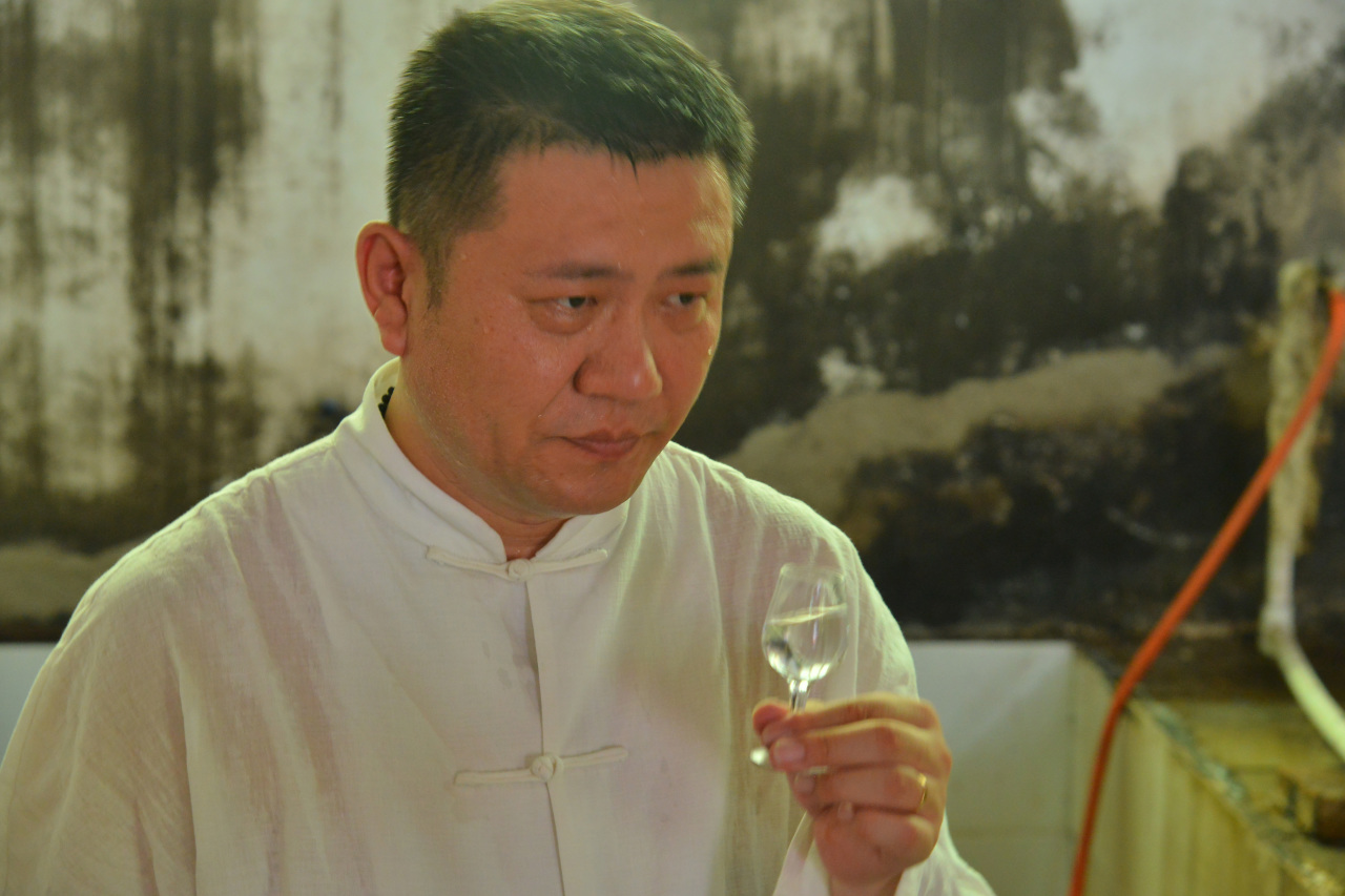 “出酒了!”新酿的原酒需要分多段摘取,中前段酒最为优质。在薛总的带领下,大家边尝、边看酒花,整个装甑、蒸酒,摘酒过程都有火候和时间要求,不能有半分马虎。